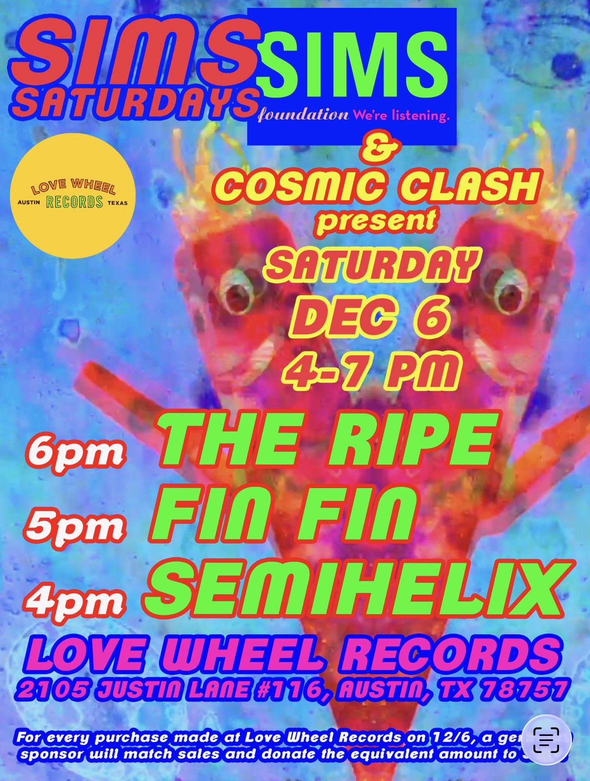 feat The Ripe, Fin Fin, Semihelix – Free Show – Every purchase in the store all day benefits the SIMS Foundation, assisting Austin musicians with access to mental health services.